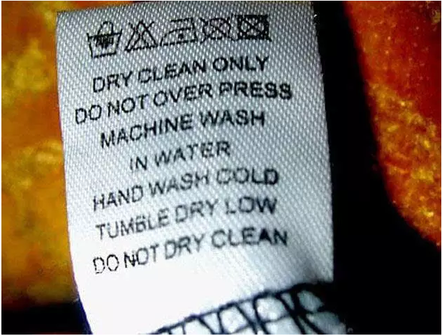 嗯,這服裝吊牌純屬是來搞笑的,可能本來還知道這么清洗的,但看了這吊牌上的洗滌方法后就蒙圈了,干脆就不洗了吧!