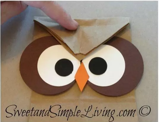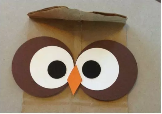 然后用紙和彩色筆制作出貓頭鷹的眼睛,再剪一個小菱形作為它的鼻子,準備就緒之后就可以把它們貼在備好的手提紙袋上了。