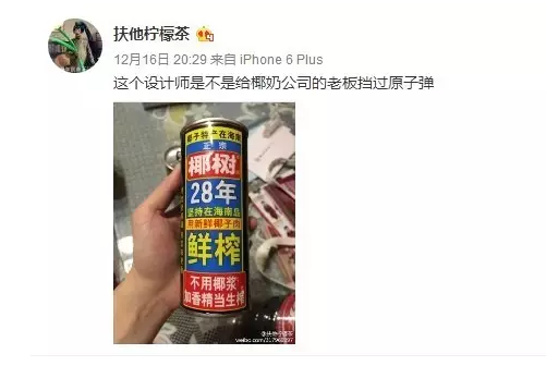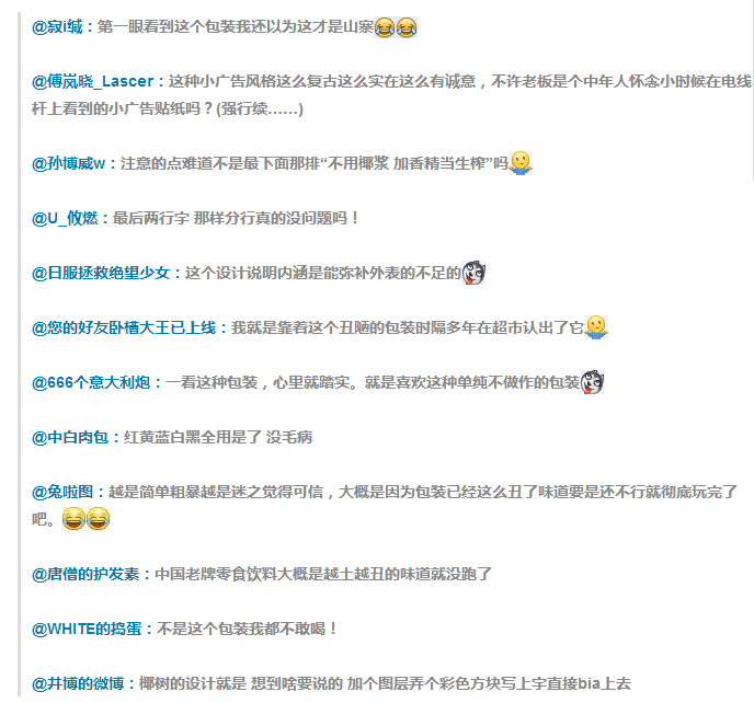 看到它,小編不由自主的想起了那些被貼滿“牛皮蘚”小廣告的電線桿!面對如此“鬼畜”的包裝,以至于讓網友們懷疑這設計師是不是給椰樹公司的老板擋過原子彈?