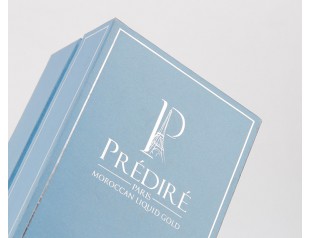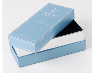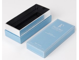 化妝品圍邊禮盒采用157g銅版紙裱1000g灰板,單色印刷,商標(biāo)燙銀,圍邊用銀光紙裱灰板。化妝品盒整體采用淺藍(lán)色作為紙盒主打色,加上銀色LOGO和盒邊白色的邊沿線搭配,清新,簡約。化妝品盒包裝設(shè)計(jì)采用成型的EVA內(nèi)托,與產(chǎn)品完全吻合,固定產(chǎn)品起到起到緩沖的作用。
