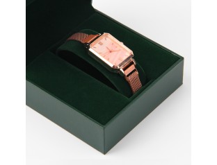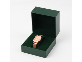 此款手表包裝盒采用了PU皮包膠胚,內(nèi)置白色EVA內(nèi)托,可用于手鏈或手表的包裝手表盒設(shè)計(jì)整體采用了紅色作為盒子主打色,可以很好的吸引消費(fèi)者的注意。手表盒四邊金黃色的線條邊沿與紅色搭配給人一種很強(qiáng)的視覺(jué)沖擊感,華麗而不沉悶。