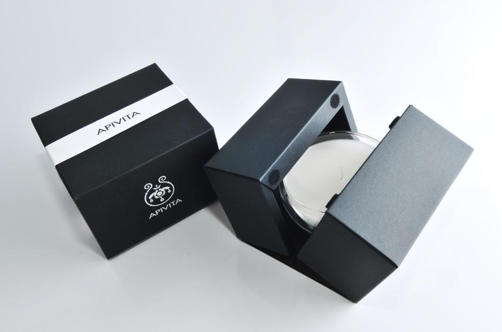 APIVITA香薰蠟燭包裝,黑色卡紙的盒型結(jié)構(gòu)比例合理、結(jié)構(gòu)嚴(yán)謹(jǐn)、造型簡單精美,突顯出盒型的形態(tài)與材質(zhì)美,力求達(dá)商品保護(hù)并襯托出透明蠋臺的層次感,左右開盒的禮盒效果展現(xiàn)商品驚喜的價值感。