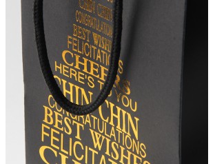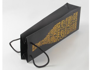 這款紅酒禮品紙袋選用的材質是雙銅紙,采用專色印刷工藝將袋身印刷成黑色,覆啞膜,袋子表面的文字則采用燙金工藝;