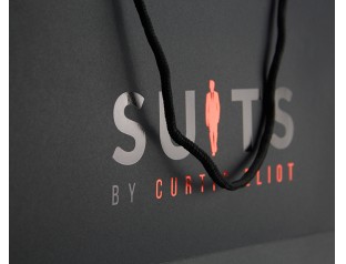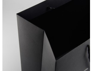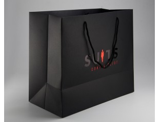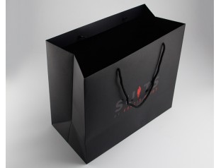 此款手提袋采用特種紙的材質(zhì),商標(biāo)燙紅金和黑金,打圓孔穿黑色棉繩。