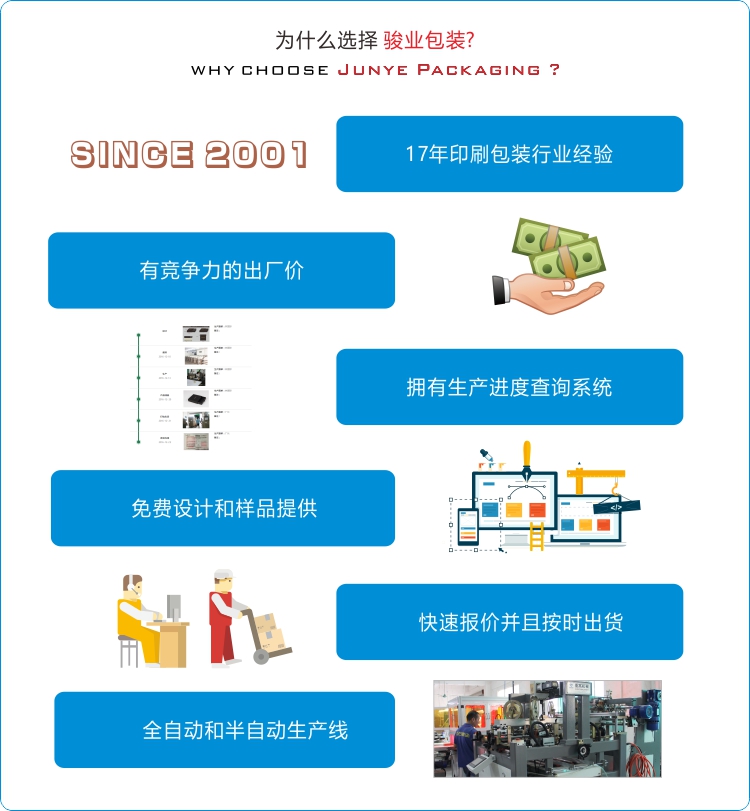 廣州駿業(yè)包裝實(shí)業(yè)有限公司創(chuàng)建于 2001年,是一家以印刷包裝制品為主營(yíng)業(yè)務(wù)的集設(shè)計(jì)、生產(chǎn)、銷(xiāo)售為一體的一般納稅企業(yè),主要生產(chǎn)各種精品包裝盒、紙袋、吊牌,其主要應(yīng)用于服飾、皮具、化妝品、保健品、禮品、首飾、茶葉、酒類、電子產(chǎn)品及其它日用制品等行業(yè),并通過(guò)了德國(guó)萊茵認(rèn)證、BV認(rèn)證、SGS認(rèn)證和WCA認(rèn)證.