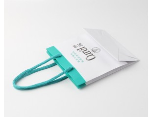 此款禮品包裝紙袋采用250g單銅紙,雙色印刷,過啞膠,自扣尼龍圓繩手提紙袋設(shè)計(jì)走小清新的風(fēng)格,整體采用白色作為主打色,搭配天藍(lán)色紙袋設(shè)計(jì)的提手處選用了天藍(lán)色的尼龍圓繩,小清新的白色和藍(lán)色搭配是藍(lán)天白云這樣一對經(jīng)典的組合,給人舒心的感覺