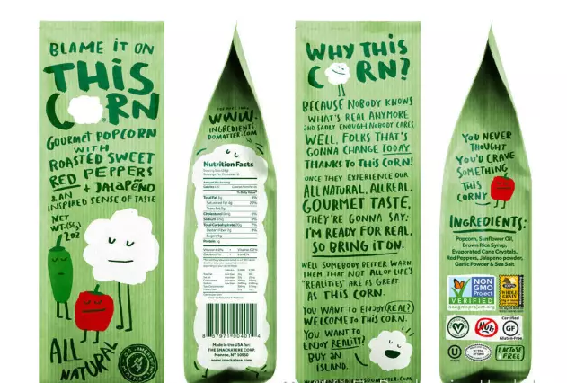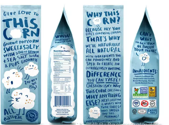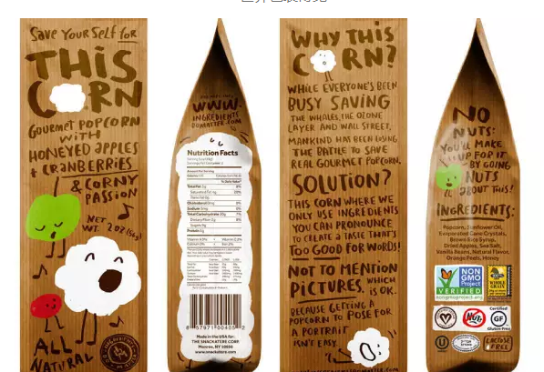 彼得·格雷格森工作室把手工風(fēng)格融入到爆米花的包裝設(shè)計(jì)中,滑稽的插圖讓產(chǎn)品看起來(lái)非常的俏皮可愛(ài)。