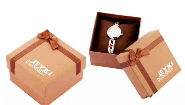 第一種:手表包裝盒,也是最低檔的一種。一般用的就是白色單粉卡紙,或說灰卡紙,以及牛皮紙。以卡盒,或說彩盒的形式,給手表進行簡單的包裝。稍微有點要求的,會在盒子的表面印上手表的圖案與生產廠家。對包裝,沒有特別的要求,對包裝的成本,通常要求最低化,不求包裝質量。也不用包裝盒的促銷功能!這樣的手表包裝盒一般都是用在買一贈一的這種模式,不知道大家還記得小時候買書包時送的手表嗎?用的就是這種手表包裝盒。