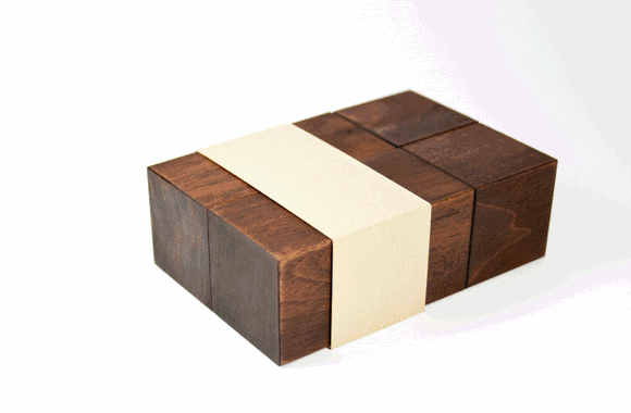 一款小編很喜歡的木質(zhì)魔方戒指盒,手指輕輕一撥就能輕松打開了。這戒指盒由6個(gè)胡桃木材質(zhì)的立方體,每3個(gè)一組,被皮繩連在了一起,其中又有3個(gè)立方體中間進(jìn)行了鉆孔處理,就是這點(diǎn)小小的改變使得剛好可以用來放戒指,是不是很有頭腦咧?